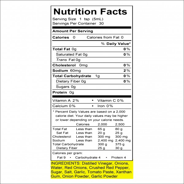 Distilled Vinegar, Onions, Water, Red Onions, Sugar, Crushed Red Pepper, Salt, Garlic, Tomato Paste, Xanthan Gum, Onion Powder, Garlic Powder